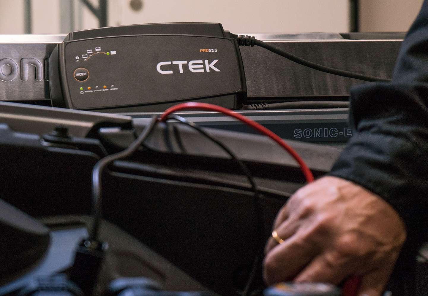 | 4. If batteries require charging, simply connect the CTEK charger while the vehicle is parked and even whilst other work is completed, without interruption. |